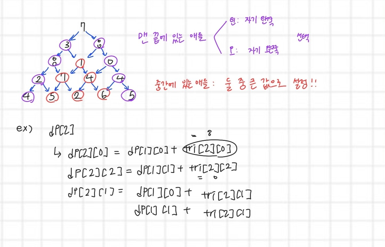 중앙에 있는 숫자의 경우 두 개의 숫자와 더할 수 있는데, 이때 가장 큰 값을 더해서 그 다음 계산에 사용할 수 있게 한다.