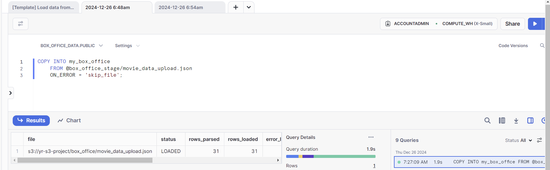 - ON_ERROR = 'skip_file' : 오류 나면 파일 건너 뛰어라