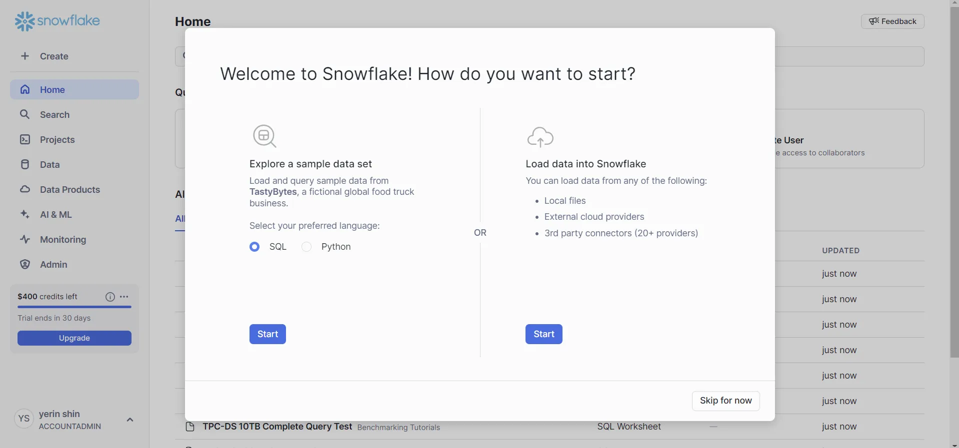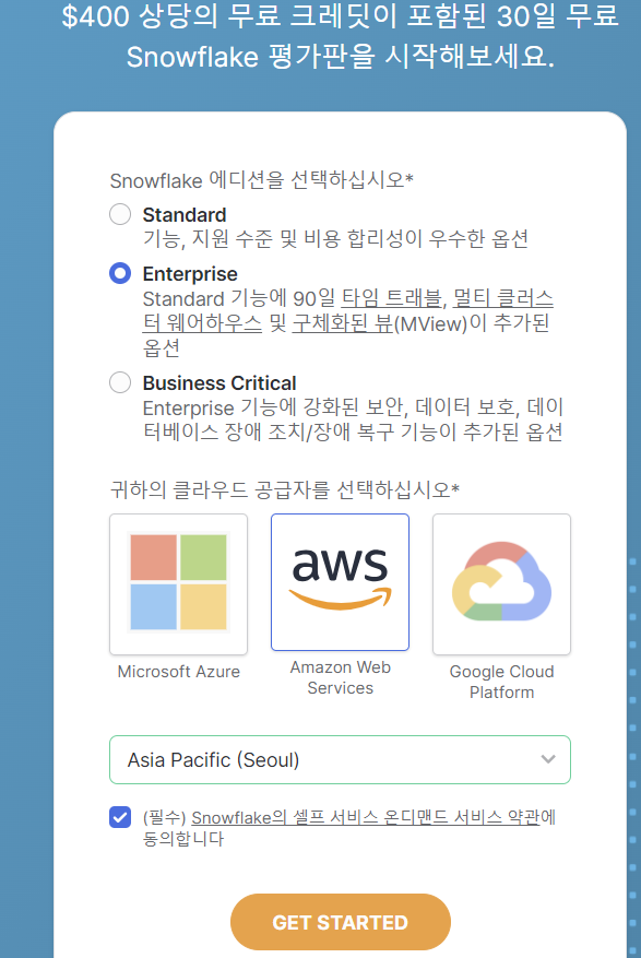 간단한 기본 정보를 작성하면 30일 동안 400 크레딧의 한도 내에서 SnowFlake를 무료로 사용해볼 수 있다.