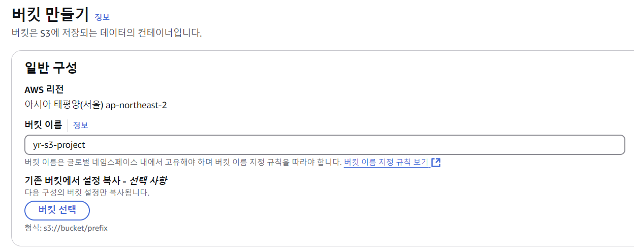 아래와 같이 간단하게 yr-s3-project라는 이름을 갖는 bucket을 생성하였다.