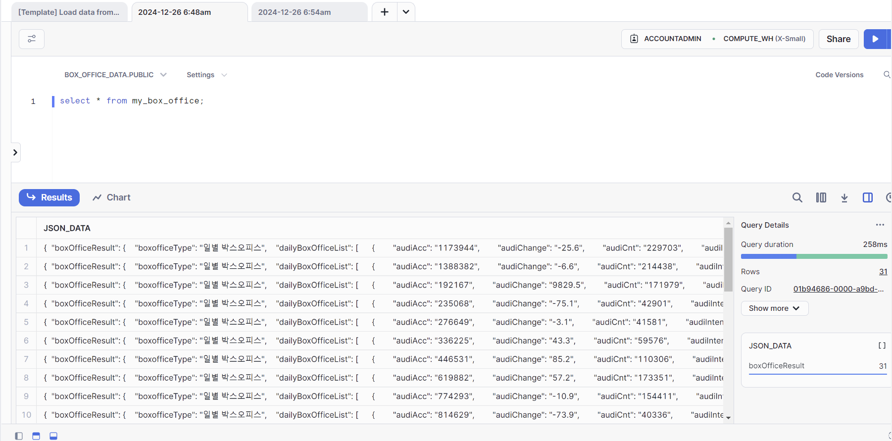 - my_box_office 테이블의 json_data열에서 boxOfficeResult.boxofficeType값을 추출한 후, 문자열로 변환
