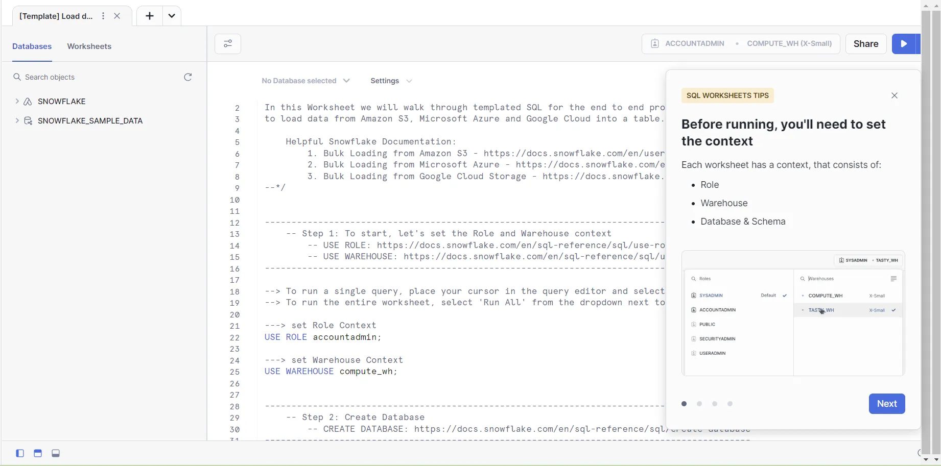나는 S3 버킷 안에 있는 데이터를 가지고 와야 하므로 Load data into Snowflake를 선택했다. 그러면 뭔가 SQL 쿼리를 보낼 수 있을 것 같은 곳이 나오게 된다.