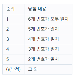 로또 6/45(이하 '로또'로 표기)는 1부터 45까지의 숫자 중 6개를 찍어서 맞히는 대표적인 복권입니다. 아래는 로또의 순위를 정하는 방식입니다.