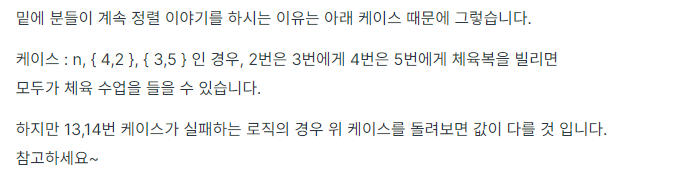 k번은 n-1 번의 체육복을 빌리면 모두가 체육 수업을 들을 수 있지만, 정렬이 안된 코드에서는 n번이 n-1을 먼저 가져가서 리스트에서 삭제하므로 k는 수업을 못듣는 것으로 처리 되는 거였다. (좋다...다들 천잰가?)