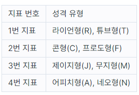 4개의 지표가 있으므로 성격 유형은 총 16(=2 x 2 x 2 x 2)가지가 나올 수 있습니다. 예를 들어, "RFMN"이나 "TCMA"와 같은 성격 유형이 있습니다.