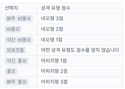 이때 검사자가 질문에서 약간 동의 선택지를 선택할 경우 어피치형(A) 성격 유형 1점을 받게 됩니다. 만약 검사자가 매우 비동의 선택지를 선택할 경우 네오형(N) 성격 유형 3점을 받게 됩니다.